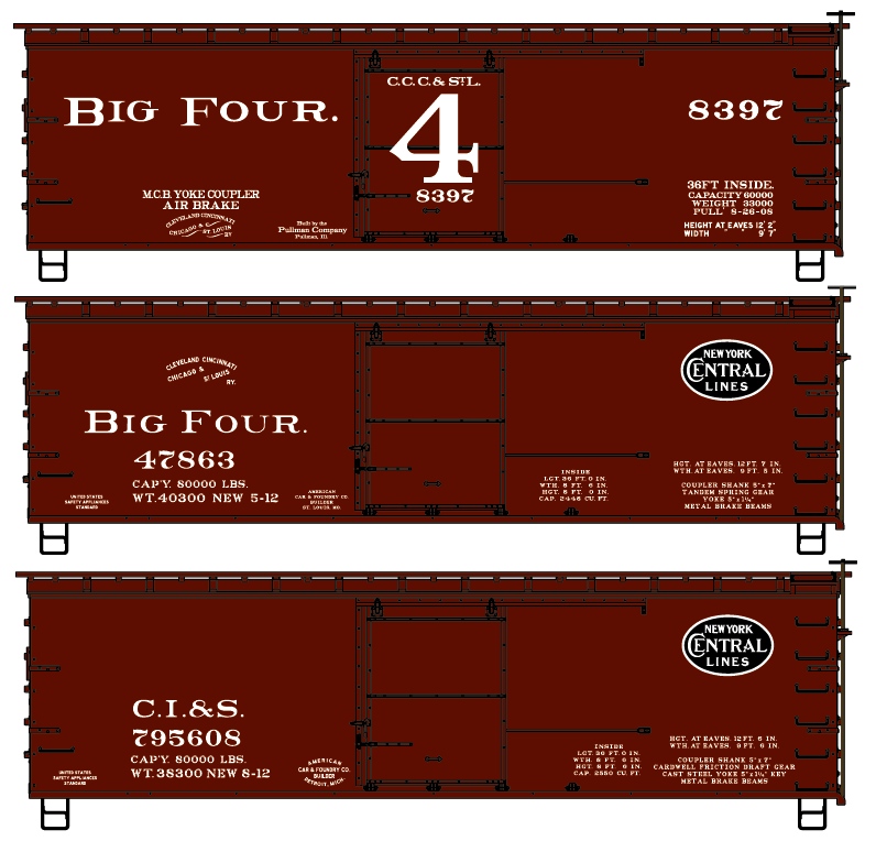 36 Double Sheath Wood Boxcar 3-Car Set Big Four, CCC&StL/NYC, CI&S/NYC |
